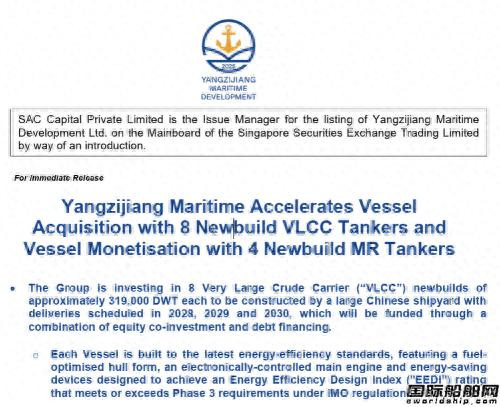 近日,扬子江海事发展有限公司(Yangzijiang Maritime Development Ltd.)晓示,在国内一家大型船坞下单订造8艘319000载重吨VLCC。
