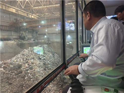 垃圾吊截止室里,本事工东谈主正在操作巨型持斗将垃圾送入毁灭炉。