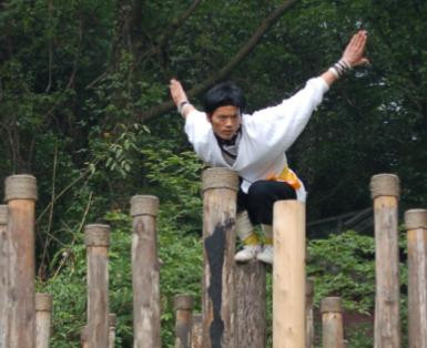 老到者要在桩头上拔擢、行走、回身,一个踩空就摔下来。