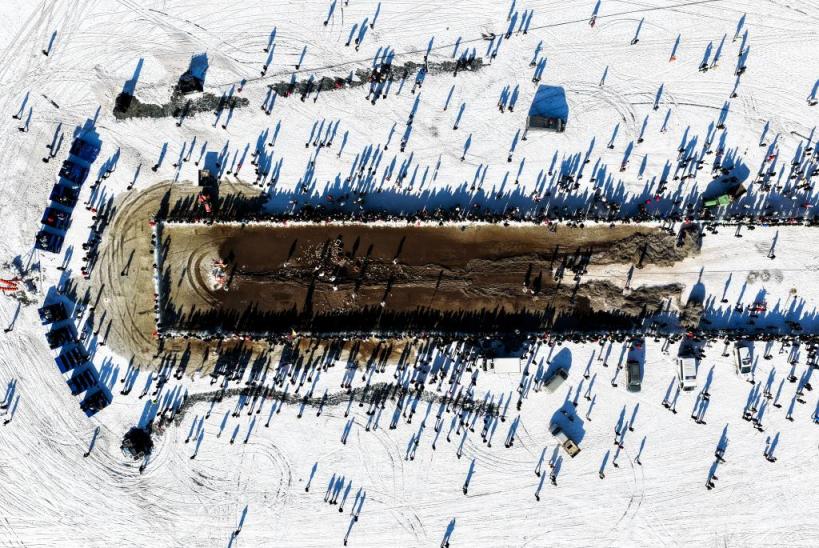 1月10日,市民和搭客们在冰面上不雅看冬捕(无东说念主机相片)。新华社记者 连振 摄