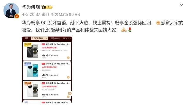 据悉,华为末端BG首席试验官何刚在近日发文默示:“华为畅享 90 系列首销,线下火热,线上霸榜!畅享全系强势总结!感谢人人的爱好,咱们会握续用好的家具和体验往来馈人人!”