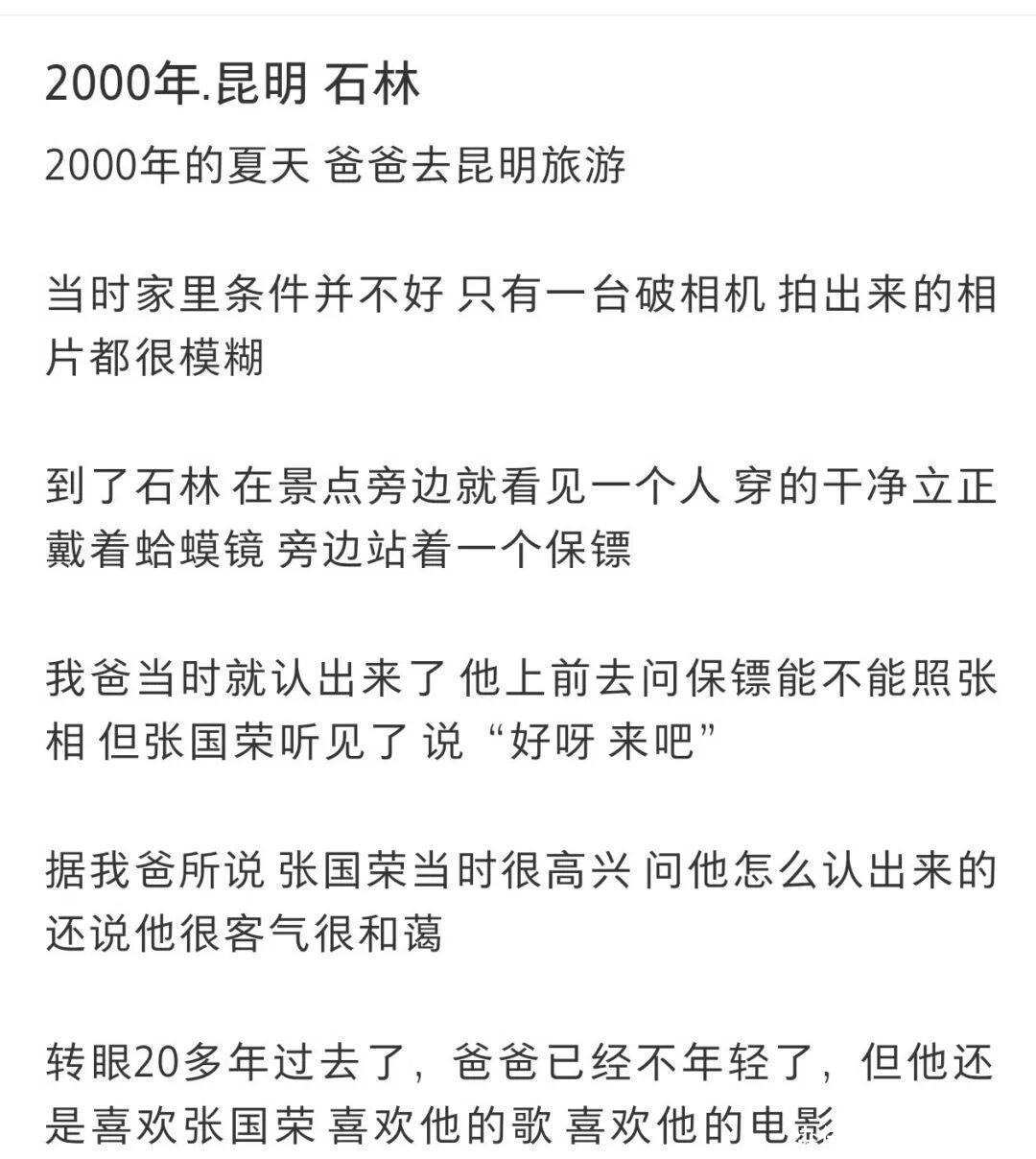 网友回忆,父亲于今齐对此次相遇回来犹新:“转瞬20多年畴昔了,爸爸还是不年青了,但他照旧心爱张国荣,心爱他的歌,心爱他的电影,尽管张国荣还是不在了。”而这张在石林拍摄的合影,也成为了这个家庭最脱落的回来,更成为了大齐荣迷心中的“意难平”与蔼然慰藉。