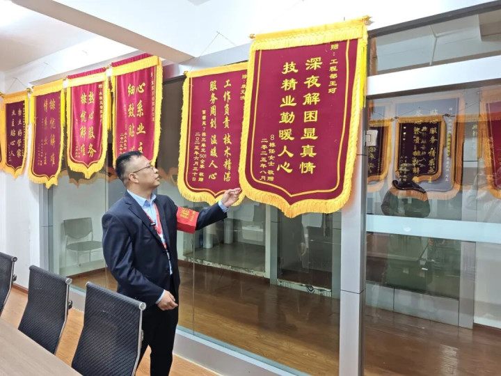 4月13日早晨,滇中新区长水航城茉莉苑,朝阳洒在怡和物业做事中心过谈满墙的锦旗上。