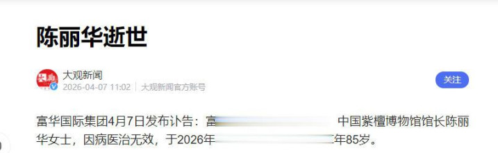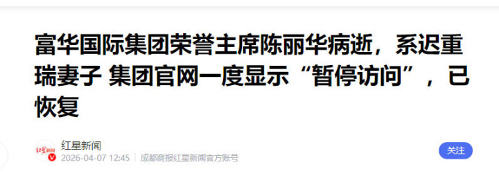 富华海外集团荣誉主席陈丽华病逝,系迟重瑞爱妻 集团官网一度夸耀“暂停拜谒”,已收复 红星新闻 2026-04-07 12:45 成都商报红星新闻官方账号